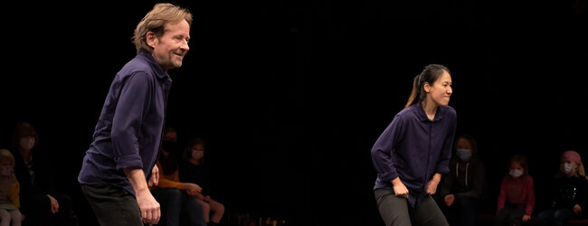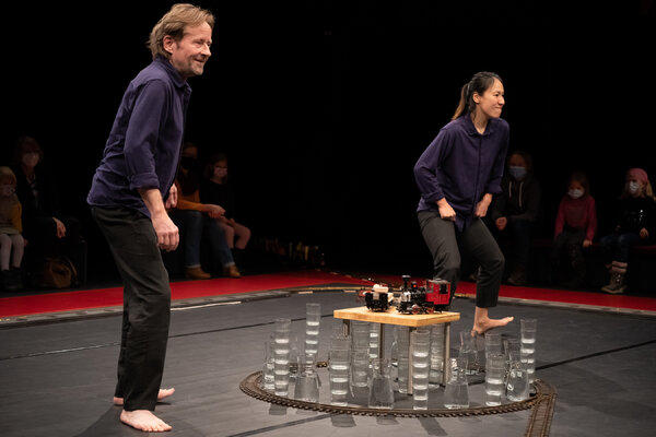 Auf der Bühne wird der Klang von Dingen erkundet, von Körpern – dem eigenen und denen der anderen. Gemeinsam mit dem Publikum untersuchen zwei Performer:innen basale Klänge. Wie klingt das Glas, aus dem ich trinke? Wie klinge ich, wenn ich trinke, schlucke? Wie klingt mein Körper?