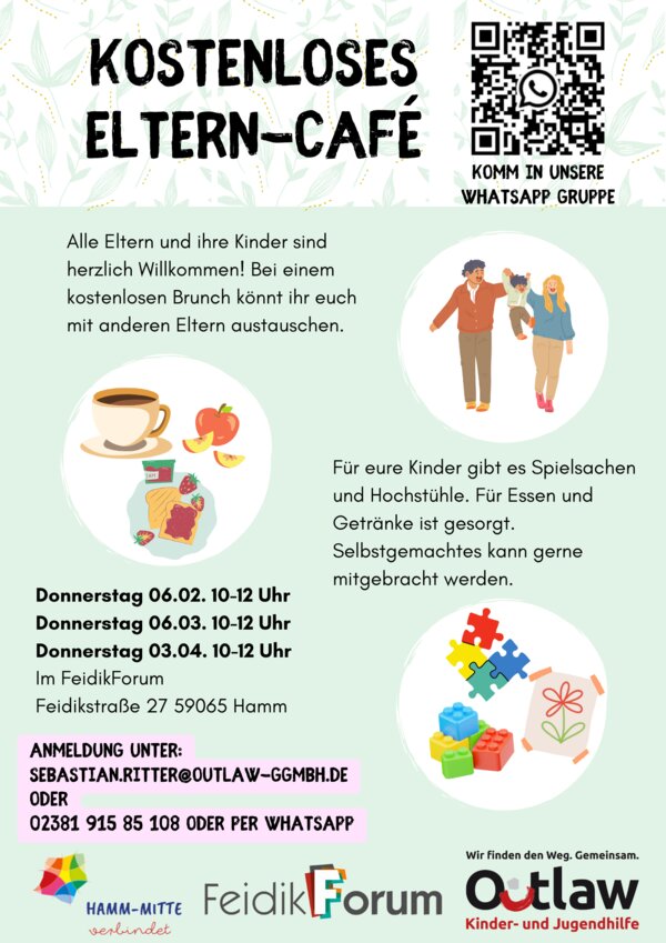 Alle Eltern sind herzlich eingeladen zum gemeinsamen Brunch. In gemütlicher Atmosphäre haben Sie die Möglichkeit mit anderen Eltern in Kontakt zu kommen und sich auszutauschen. Ihre Kinder sind ebenfalls herzlich Willkommen. Hochstühle, Spielsachen, Malsachen usw. stehen ihren Kleinen zur Verfügung. Das Angebot ist kostenlos. Gerne können Sie auch Selbstgemachtes mitbringen. Unser sozialpädagogisches Fachpersonal steht Ihnen bei Bedarf für Fragen und Tipps rund um das Thema Kindheit und Erziehung gerne zur Verfügung.