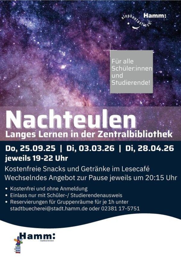 Reservierungen für Gruppenräume für je 1h unter unter stadtbuecherei@stadt.hamm.de, Tel.: 02381/17-5751