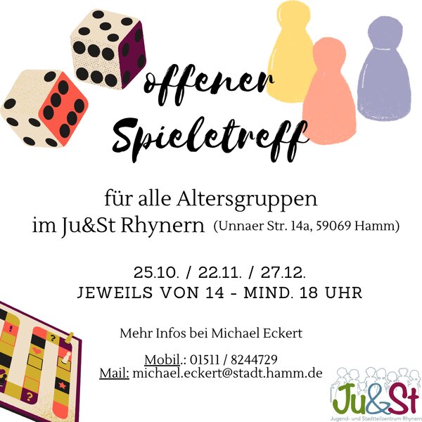 Spieletreff für alle, die gerne Gesellschaftsspiele spielen. Ob mit viel oder wenig Erfahrung, alle sind herzlich willkommen. Wer will, kann gerne eigene Spiele mitbringen. Ansonsten sind auch viele Spiele vor Ort vorhanden.