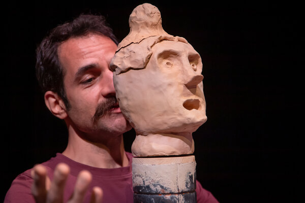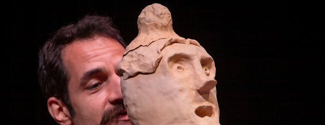 Erst ist da nur ein Klumpen Ton. Daraus wird eine Kugel. Mit dem Finger wird ein Loch in die Kugel gebohrt. Ein zweites daneben. Eine einfache Nase entsteht, ein Mund. Und schon haben die beiden Spieler:innen auf der Bühne einen neuen Mitspieler.