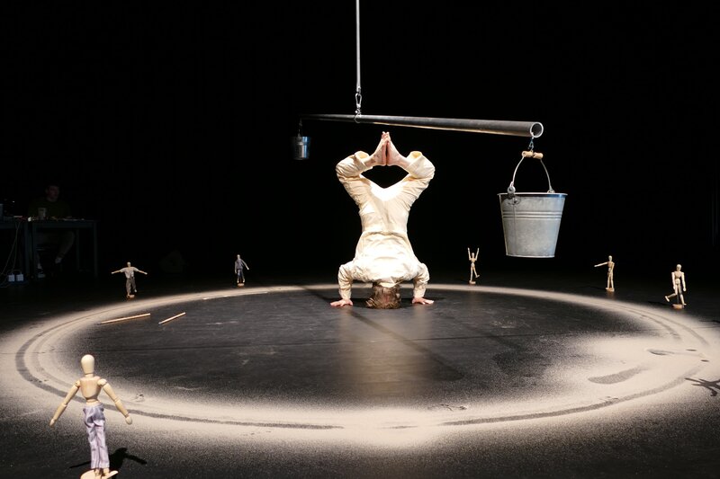Mit großer Experimentierfreude wird auf der Bühne ein Raum geschaffen, in dem sich Kunst und Philosophie treffen. Argumente werden abgewogen. Gleichgewichte werden gesucht. Wohnt das Glück im Gleichgewicht? Wie schwer wiegen Worte und Taten?