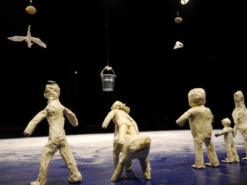 Auf der Bühne treten Elemente des Lebens miteinander in Verbindung. Ein Stein pendelt durch die Luft, ein Eimer zieht seine Kreise und ein Mensch hinterlässt sandige Spuren. Der Kreis des Lebens, der Freundeskreis, der Familienkreis, das Planetensystem – alles verläuft in Kreisen. Alles klingt.